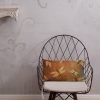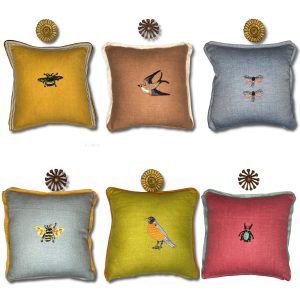 The front of the pillow is constructed out of slate blue linen. At the center there is a orange and grey embroidery bird (robin) patch appliqued. At the seams there is orange felt cord trim with a striped gros gain ribbon that creates a flange. The pillow opens at the bottom with a concealed zipper. The back is beige. Size options include: 12″x12″ (photographed), 14″x14″ or 16″x16 and can be purchased as a cover only, include a poly fil or down pillow insert.