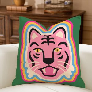 6. Tiger Party: A yellow pillow covered in pink repeating tigers.
