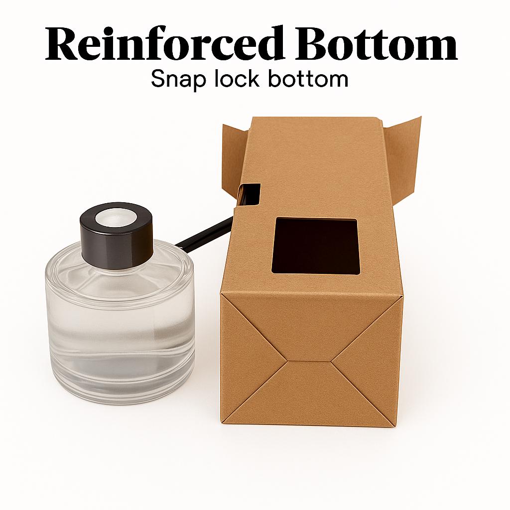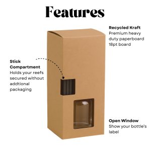 Present your products in style with our Recycled Kraft diffuser boxes, designed specifically to securely hold your bottles and diffuser sticks. Made from durable 18pt paperboard with a uncoated finish, these boxes feature a unique stick compartment that keeps your reeds in place without any extra packaging. The reinforced snap-lock bottom ensures a sturdy base, while the open window allows you to showcase your bottle’s label. Select quantity from drop down menus.